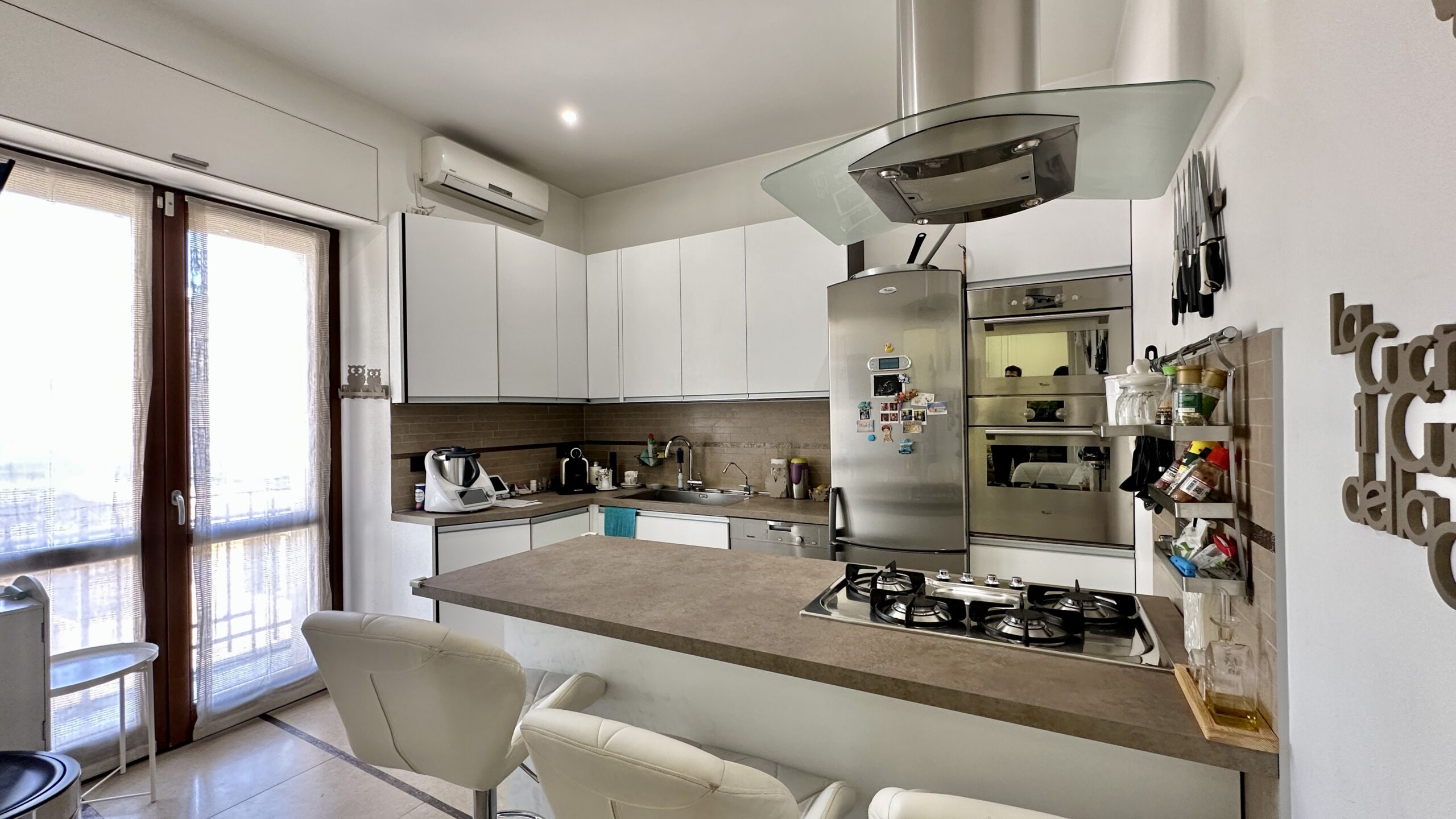 La proprietà è composta da una zona living molto luminosa dotata di finestre che si affacciano sullo spazio esterno ,da una cucina abitabile con isola anch’essa con uscita sul balcone che corre intorno alla proprietà.